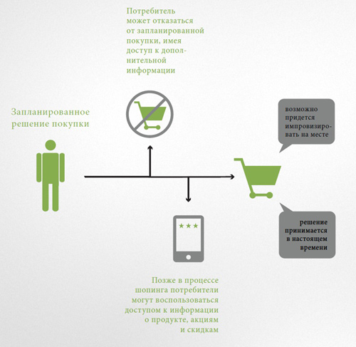 Мобильное устройство позволяет покупать самые разнообразные вещи, сидя на скучной встрече, или заказывать ужин с доставкой на дом на конкретное время, будучи на вечернем совещании. Как результат, шопинг перестает быть предсказуемым. Люди могут менять решение о покупке товара прямо в магазине, и запланированная покупка может быть легко пересмотрена.