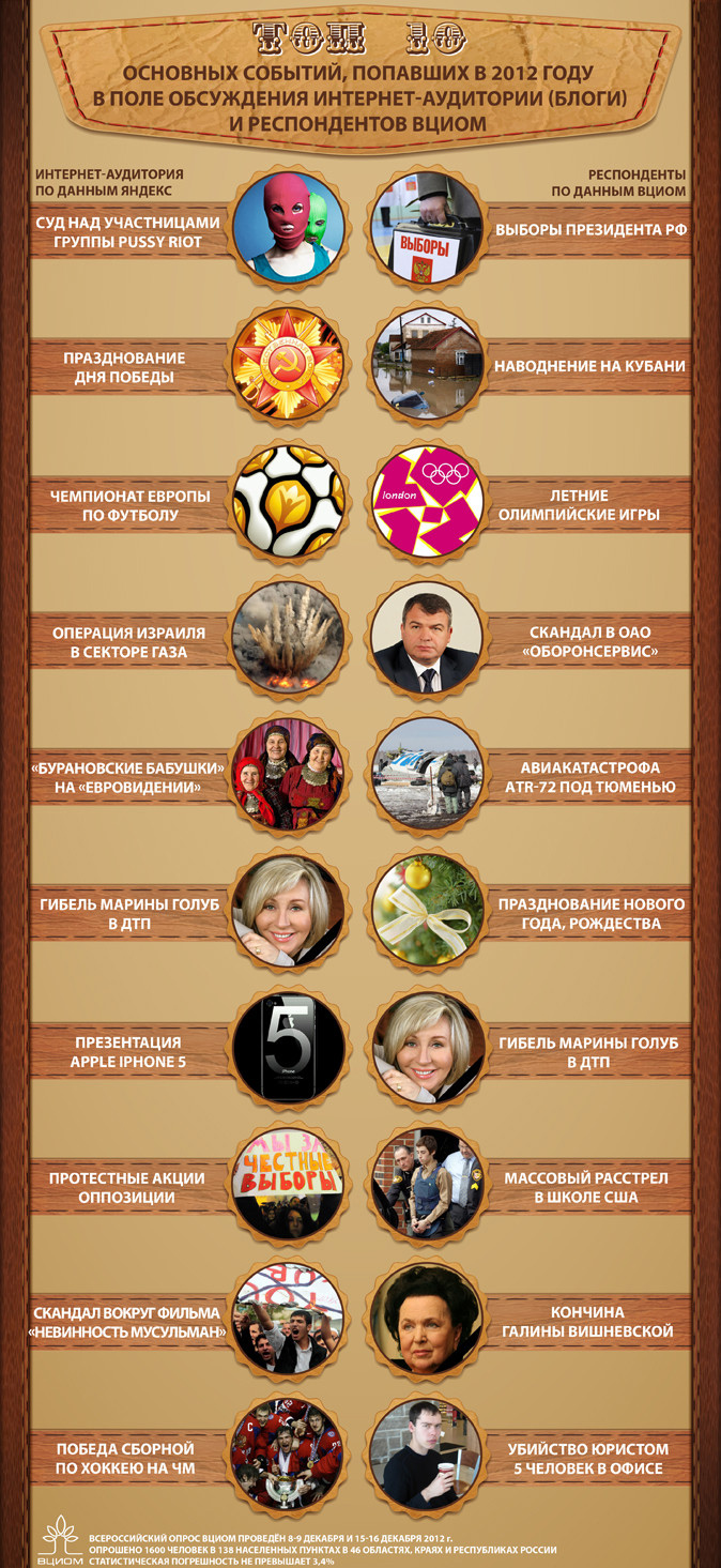Россияне проголосовали за Путина и ДонцовуВЦИОМ подвел итоги-2012: большинство жителей страны считает год удачным Более половины россиян положительно отзываются о 2012 годе. Как выяснили социологи, 50% соотечественников прожили его «в целом хорошо», а для 5% уходящий год стал очень удачным. Однако многие отмечают, что для страны в целом это был трудный период. Новый год россияне встречают с «ровным» настроением – без особого подъема, но и без негативных эмоций. При этом большинство (59%) людей надеется, что 2013-й сложится хорошо как для их семей, так и для страны. Таковы результаты опроса ВЦИОМ. Главными событиями для респондентов ВЦИОМ стали выборы президента, наводнение на Кубани, Олимпийские Игры в Лондоне и коррупционные скандалы в «Оборонсервисе». Блогосферу же занимал процесс над Pussy Riot, День Победы, Чемпионат Европы по футболу и конфликт в Секторе Газа, свидетельствуют данные «Яндекса». Политиком года россияне традиционно назвали Владимира Путина, писателем – Дарью Донцову (ей удалось потеснить Бориса Акунина). Певцом уходящего года респонденты признали Стаса Михайлова, тогда как Филипп Киркоров и Николай Басков разделили второе место. Фильмом года соотечественники признали «Сумерки. Сага», лучшим сериалом стали «Интерны», а главной телепрограммой страны остается «Пусть говорят». |