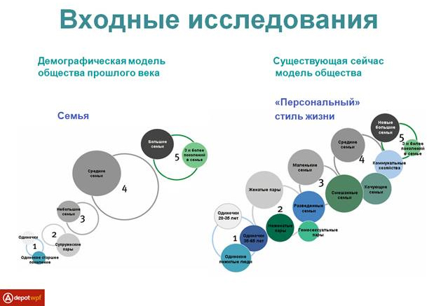 На место абстрактных семейных ценностей (суммы различных противонаправленных векторов в одной ячейке общества, изображаемых в виде четырех улыбающихся человечков с растопыренными руками) приходят ценности индивидуальные. В качестве примера можно привести упаковку полуфабрикатов для мам с задачей снять фрустрацию из-за того, что она не стоит у плиты, а покупает фаст-фуд. Или упаковку пива для папы, который хоть и пьет его, но при этом, например, приносит пользу семейному бюджету.