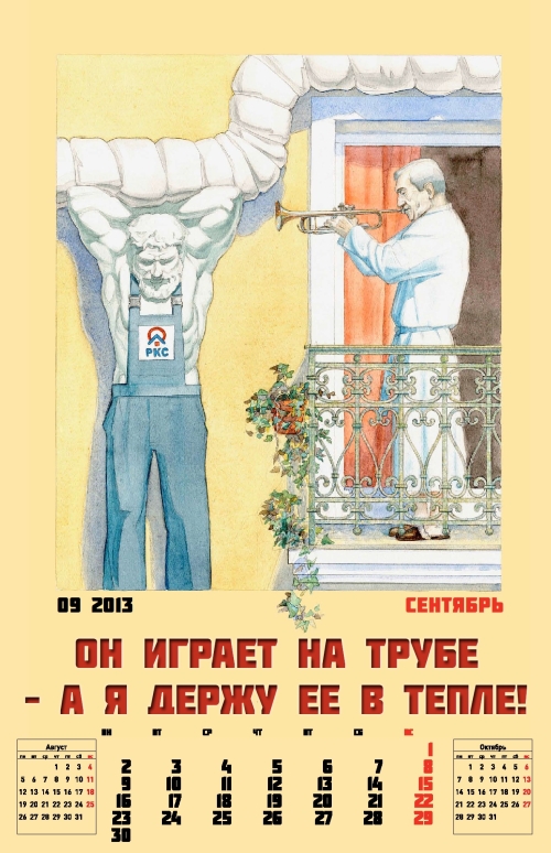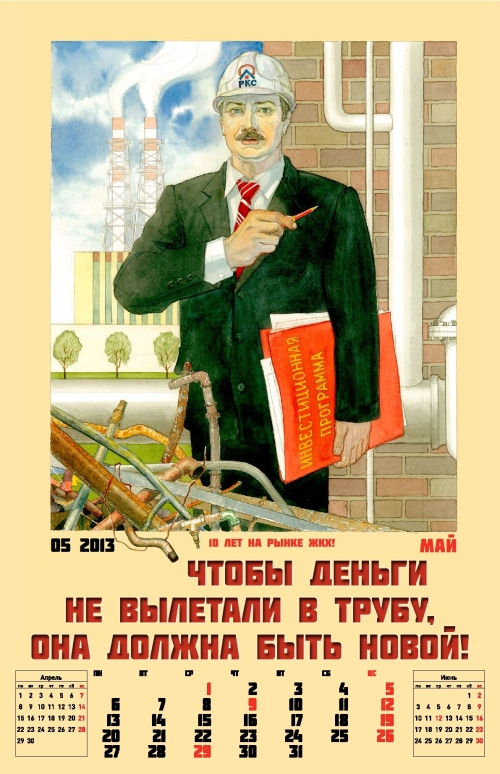 ЖКХ прорекламировали в советском стилеРоссийские коммунальные системы выпустили корпоративный календарь Российские коммунальные системы на своем официальном сайте представили корпоративный календарь на 2013 год под слоганом «Нет прекрасней жениха, чем работник ЖКХ!». Календарь выполнен в жанре советского плаката с угадывающимися элементами современных реалий. Как утверждают в РКС, этот выбор был сделан не случайно – 30 декабря 2011 года исполнилось ровно 90 лет со дня образования СССР. «Для календаря выбрана необычная стилистика - совмещение жанра советского плаката и современных реалий. Монументализм сочетается в нем с игрой смыслов и легкой долей юмора. Двенадцать зарисовок на актуальные темы современного ЖКХ сопровождаются емкими призывами-лозунгами», - говорят создатели.