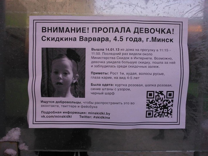 Белорусский сайт «Министерство скидок» прорекламировал себя с помощью объявлений о пропаже ребенка. Листовки были стилизованы под настоящие сообщения о пропавших детях и содержали изображение девочки. «Внимание! Пропала девочка! Скидкина Варвара, 4.5 года, г.Минск. Вышла 14.01.13 из дома на прогулку. Последний раз видели около Министерства Скидок в Интернете. Возможно, девочка увидела большую скидку, пошла за ней и заблудилась среди скидочных залеж» (орфография и пунктуация авторов – Sostav.ru). На сайте проекта история получила продолжение: «По словам бабушки Скидкиной Варвары, девочка пропала, когда вышла с бабушкой в интернет. Ходим мы, значыть, ходим, ну, тут интарнет, Миша Маваши всякие, птички, петушки на палочке, я на картинки борстча засмотрелася, потом гля — нету Варвары, только скидка на креветки блишчыць!» После публикации на портале Onliner.by «Министерство скидок» принесло извинения «за возникшую путаницу». Создатели рекламы объяснили, что не хотели никого вводить в заблуждение. «Конечно, если бы пропала настоящая девочка, мы обязательно приняли бы участие в ее поисках», – говорится в обращении. |