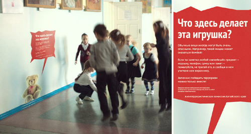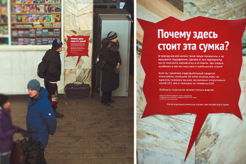 Вторая часть кампании - это ambient media, рекламные носители, встроенные в среду. На стены в местах скопления людей — на вокзалах, в школах, в аэропортах, в подъездах домов — наклеиваются изображение предметов, которые вполне могут там находиться, и именно на эту обыденность и повседневность делается акцент. «Бесхозные» вещи могут нести угрозу!