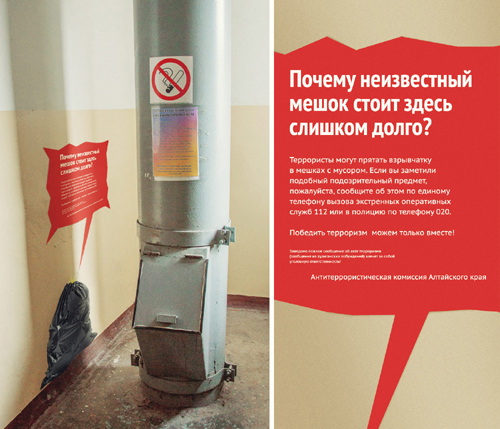 PUNK YOU поможет в борьбе с терроризмомАнтитеррористическая рекламная кампания расширяет границы Администрация Алтайского края и УФСБ России поставили перед специалистами PUNK YOU задачу разработать комплексную информационную антитеррористическую кампанию, простым и доступным языком донести до населения опасность угрозы от террроризма, без пафоса и страшных картинок, а также информировать о наличие единого телефона вызова экстренных служб 112. Пилотным регионом реализации проекта стал Алтайский край. Теперь в кампании задействован ряд других регионов. Рекламная кампания состоит из двух частей. Первая часть — это информационно-побудительные плакаты. Плакаты выполнены в сдержанной цветографике, чтобы не создавать ощущение паники, а спокойно призывать к бдительности.
