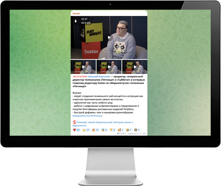 | Брендирование Telegram канала Sostav | Обновление заглавной аватарки канала в стиле рекламодателя, закрепление в важном поста с новостью. | 270 000 ₽ |