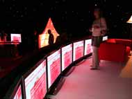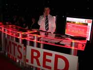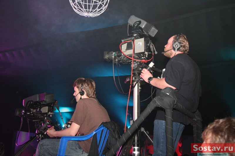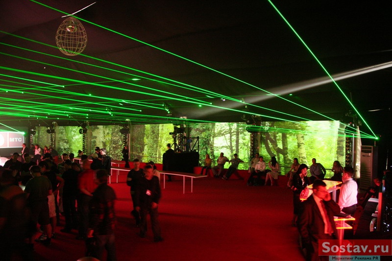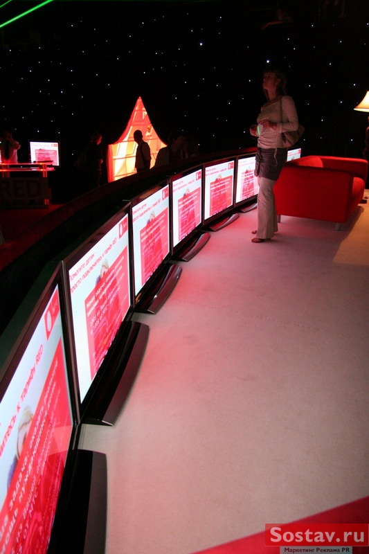 Сразу отмечу детали, которые определяли масштаб и уровень мероприятия: вместительный шатёр, художественное оформление, промо-гёрлз в причёсках Анджелы Дэвис, техническое обеспечение, в частности - видео: информационные табло, ограждения чил-аута, столешницы - такого количества плазм в разнообразных вариациях использования в оформлении интерьера я не видел никогда. Обе продольные стены шатра использовались как просветные экраны, на них помимо рекламы транслировались панорамные слайды хорошего разрешения. В центре зала стоял круглый светодиодный экран, вокруг него расположился бар. Напитки в баре не кончались, кейтеринг был "на уровне".
