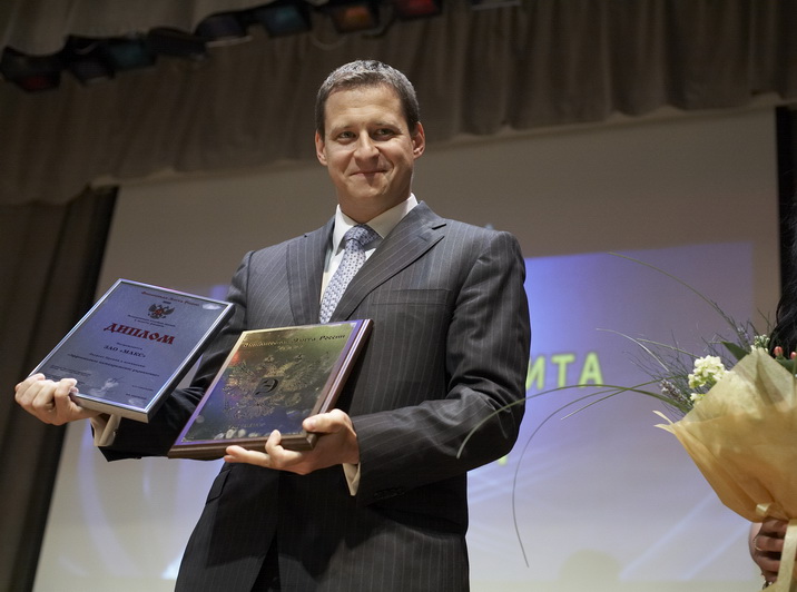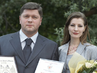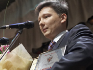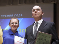Зам.Генерального директора агентства "Эксперт РА" Павел Самиев вручает приз и диплом Лауреата Зам. Генерального директора СГ "Уралсиб" С.В. Огорельцеву