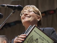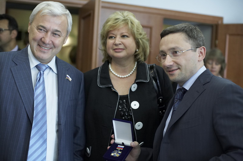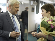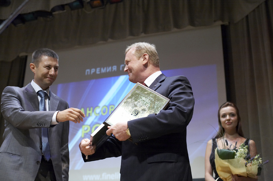 "Зам. Председателя комитета ГД РФ по финансовому рынку Лиана Пепеляева вручает призы Генеральному Директору компании "ФБ-ЛИЗИНГ" Андреасу Ланге"