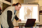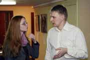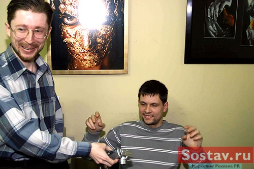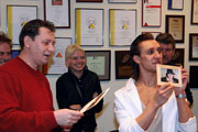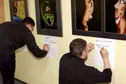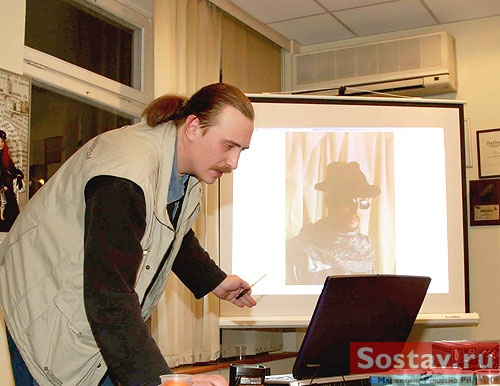 Удивительно, но даже у тех, кто не имеет отношения к фотоискусству, вызвали интерес технологии и детали создания той или иной работы. С любовью к слушателям и к своему делу Максим рассказывал, как создавались декорации, как наносился грим, рассказывал про самоотверженность моделей и о звездах, с которыми ему доводилось работать! Так незаметно закончилась официальная часть и началась неофициальная... За день до "Дня дураков" в "Бегемоте" подурачились на славу! Кроме несерьезной лотереи и конкурса фотографий, о котором чуть позже, проводились соревнования на самую оригинальную подпись к выставленным фотоработам. Победило название к боди-арту, изображающему череп на пятой точке человеческого тела: "ЧереПопа". Главный "копирайтер" вечера получил постер Полубояринова с памятным автографом.