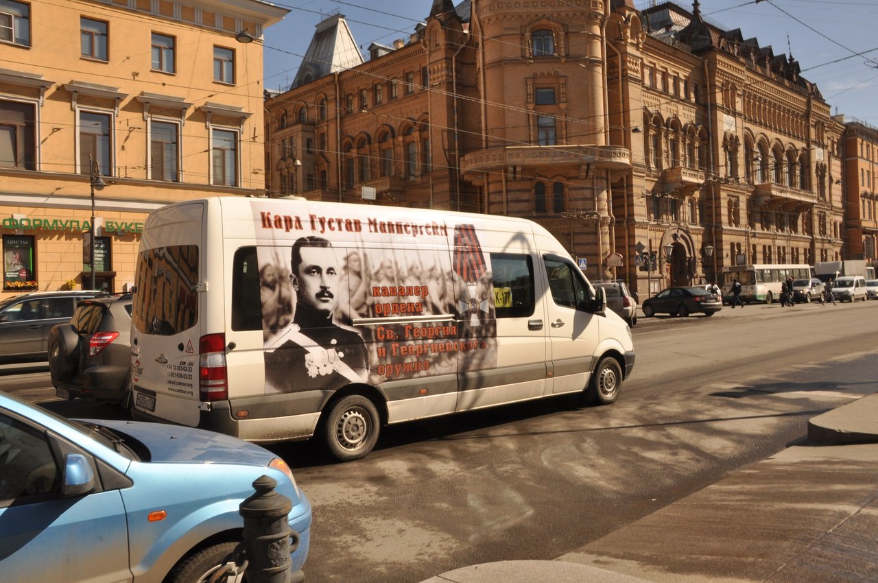 На маршрутке был размещен портрет маршала Карла Густава Маннергейма с Георгиевским крестом и надписью «Густав Маннергейм, кавалер ордена Св.Георгия и Георгиевского оружия».