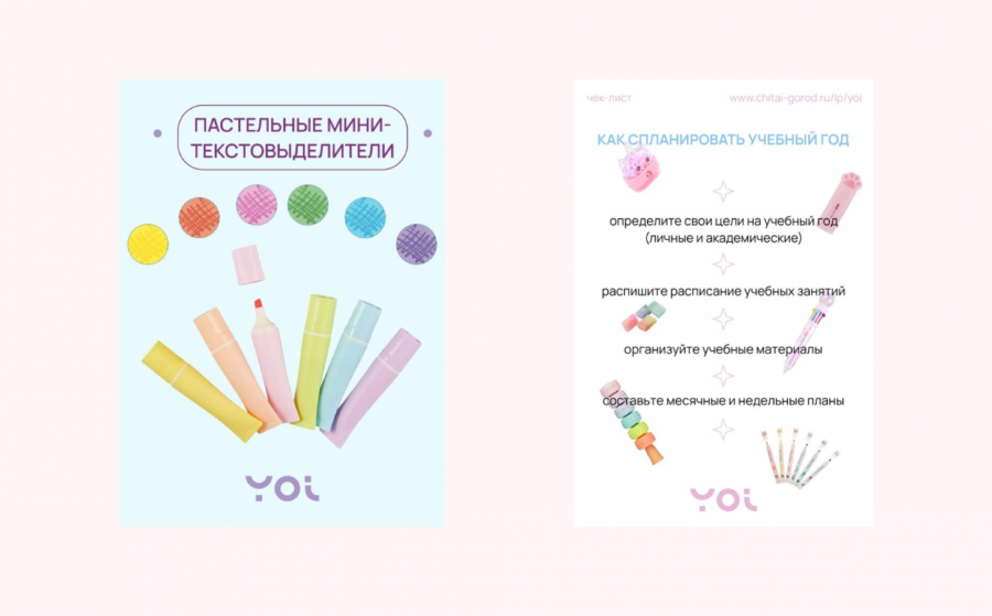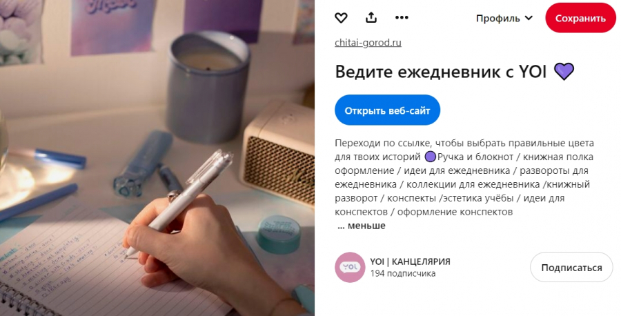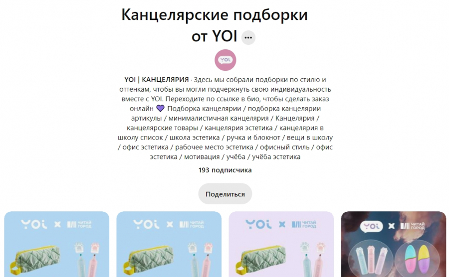 Мы предложили провести эксперимент нашему клиенту — ведущему книжному магазину «Читай-город». Начать решили с запуска аккаунта на Pinterest для YOI — бренда канцелярии, представленного в магазинах сети. Логика простая: бренд YOI создаёт эстетичные ручки, маркеры и блокноты, которыми приятно пользоваться. Поэтому он идеально подходит для соцсетей и площадок, идея которых заключается в поиске референсов и вдохновения пользователей.