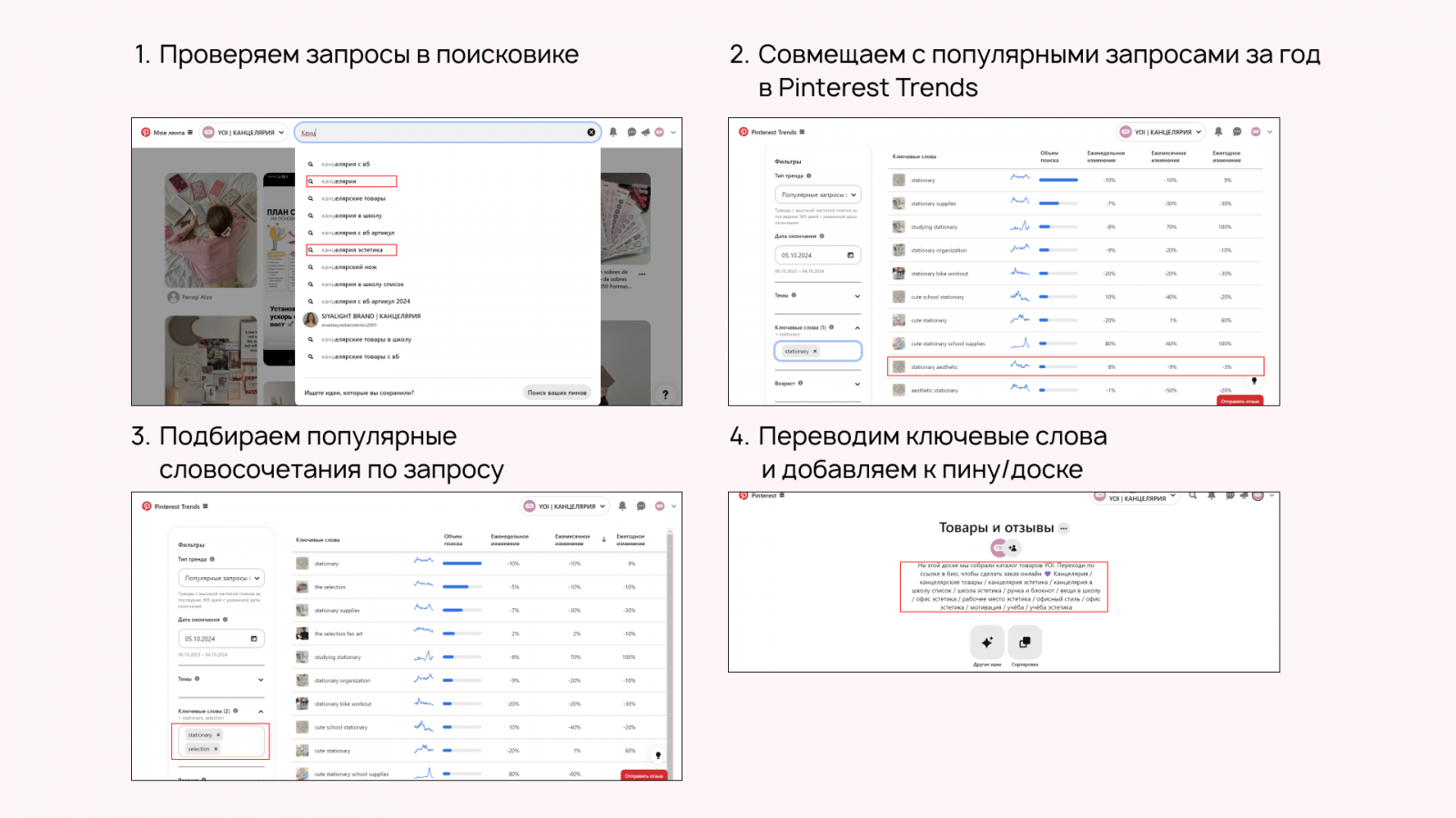 Ещё хорошо работают ключевые фразы — словосочетания, по которым пользователи ищут референсы внутри платформы. Мы открыли Pinterest Trends, выбрали самые популярные запросы по канцелярии и рабочему столу за год и затем перевели их на русский язык.