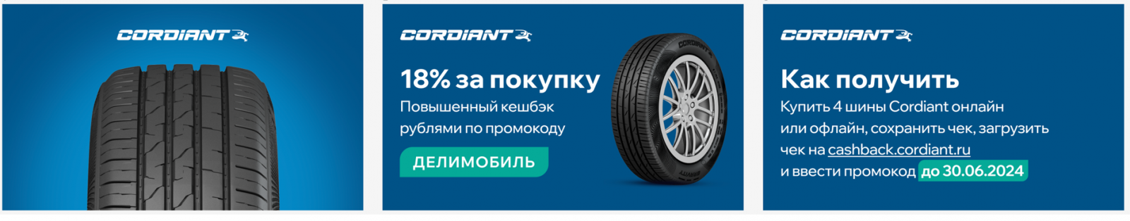 Сотрудничество каршеринга «Делимобиль» и производителя шин Cordiant берет свое начало в 2022 году. К этому летнему сезону в резину Cordiant был обут каждый четвертый автомобиль автопарка сервиса, размер которого в середине 2024 года перевалил за 30 тыс. автомобилей в 13 городах-присутствия. Текущая кампания стартовала в мае 2024 во время сезонного шиномонтажа и продлилась до 31 августа.