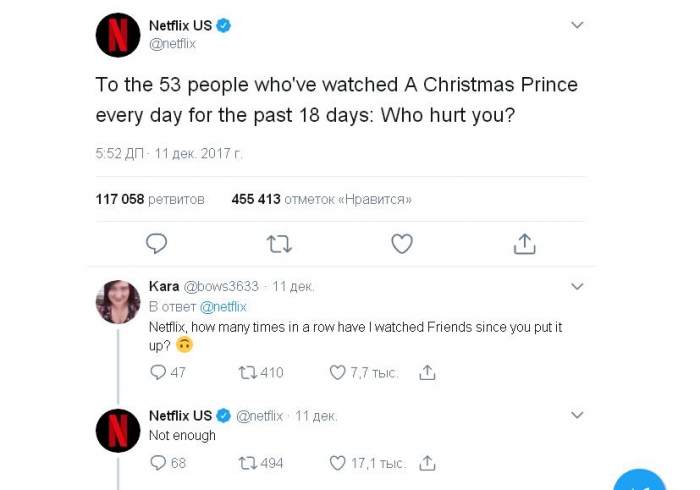 Используя данные Spotify о телеаудитории, компания Netflix думала, что сможет с новой силой раскрутить изворотливую маркетинговую кампанию в Twitter в предрождественский сезон. «53 человека, которые смотрели «Рождественского принца» каждый день в течение прошлых 18 дней: Кто причинил Вам боль?». Разве этот твит может понравится аудитории или мотивировать к просмотру?
