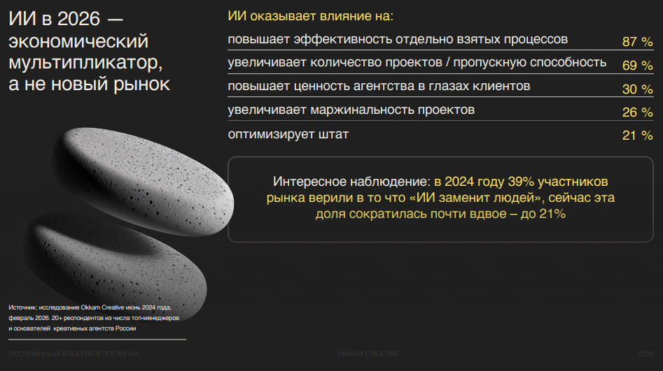 В работе агентств ИИ ускоряет процессы и повышает пропускную способность команд, но не отменяет затрат на экспертизу, контроль и постпродакшен. 87% респондентов отметили рост эффективности процессов, 69% — увеличение количества проектов и пропускной способности. Но ожидания заказчиков о десятикратном удешевлении не оправдываются. Кроме того, инструмент вышел за рамки креативных отделов: им пользуются 82% стратегов и аналитиков, 78% копирайтеров. Также рынок переосмыслил влияние ИИ на структуру команд. Если в 2024 году 39% агентств ожидали сокращения штата, то в 2026-м эта доля упала до 21%. Теперь ИИ видят не как инструмент оптимизации персонала, а как способ повысить эффективность и пропускную способность без радикальных изменений в штате.
