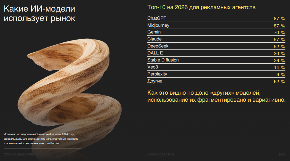 По данным исследования, ИИ используют 100% опрошенных рекламных агентств. Рынок охватывает широкий спектр моделей: лидерами стали ChatGPT и Midjourney (по 87% агентств). ChatGPT — универсальный инструмент для текстов, аналитики, ресерча и работы с документами. Midjourney — стандарт для генерации визуалов и быстрых креативных прототипов. Далее следуют Gemini (70%), который востребован за счет интеграции с экосистемой Google, и Claude (57%). Последнюю нейросеть чаще применяют для анализа и обработки больших объемов текста. Всего в ходе исследования респонденты упомянули более 20 различных ИИ-моделей. Помимо глобальных лидеров, в агентствах используют нишевые и региональные решения — от бесплатного китайского DeepSeek до российских нейросетей. Таким образом агентства подбирают инструменты под конкретные задачи, активно исследуя рынок.