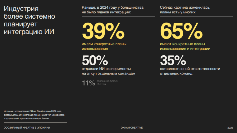 Пятница!, показывает: в 2026 году ИИ используют 100% агентств. Ключевое изменение — в зрелости: доля компаний с централизованным планом внедрения нейросетей выросла с 39% в 2024-м до 65% сегодня. Рынок эволюционирует от разрозненных экспериментов к осознанному и управляемому использованию ИИ.