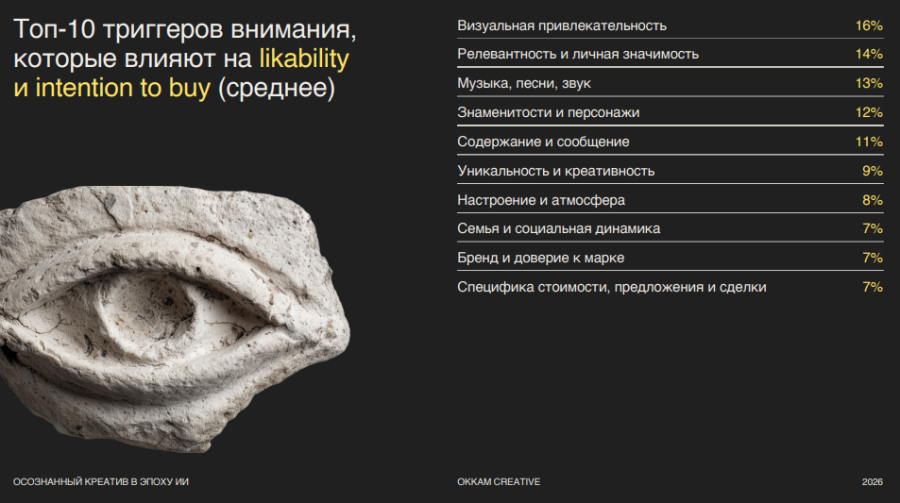 На этом фоне роль человека в креативе усиливается. Изучение кейсов, ставших призерами крупнейших креативных фестивалей, свидетельствует о том, что значительный пласт наиболее резонансных кампаний года был реализован без привлечения ИИ. Успех таких проектов обеспечили высокий уровень крафта, глубокий потребительский инсайт и точная работа с триггерами внимания. Статистические данные подтверждают жизнеспособность этой модели: реклама, в основе которой лежит глубокий инсайт, демонстрирует явное преимущество в глазах аудитории — при прямом сравнении 62% респондентов отдают предпочтение именно ей. Подобный подход гарантирует качественный рост ключевых KPI: в частности, восприятие бренда как «близкого к жизни» увеличивается на 12,7 п.п., а его привлекательность — на 7,4 п.п.