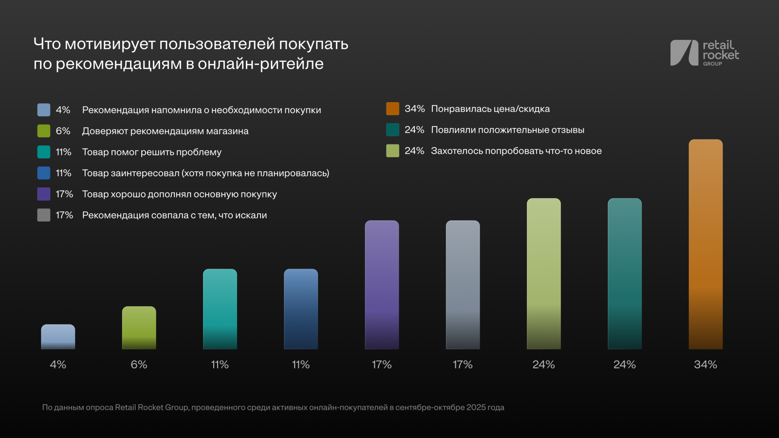 Пользователи, никогда не покупавшие через рекомендации, назвали условия, которые могли бы изменить их поведение: соответствие ценовому диапазону (31%), демонстрация реальной экономии (31%), более точный учет интересов (19%), помощь в поиске редких товаров (18%), объяснение релевантности рекомендации (13%).
