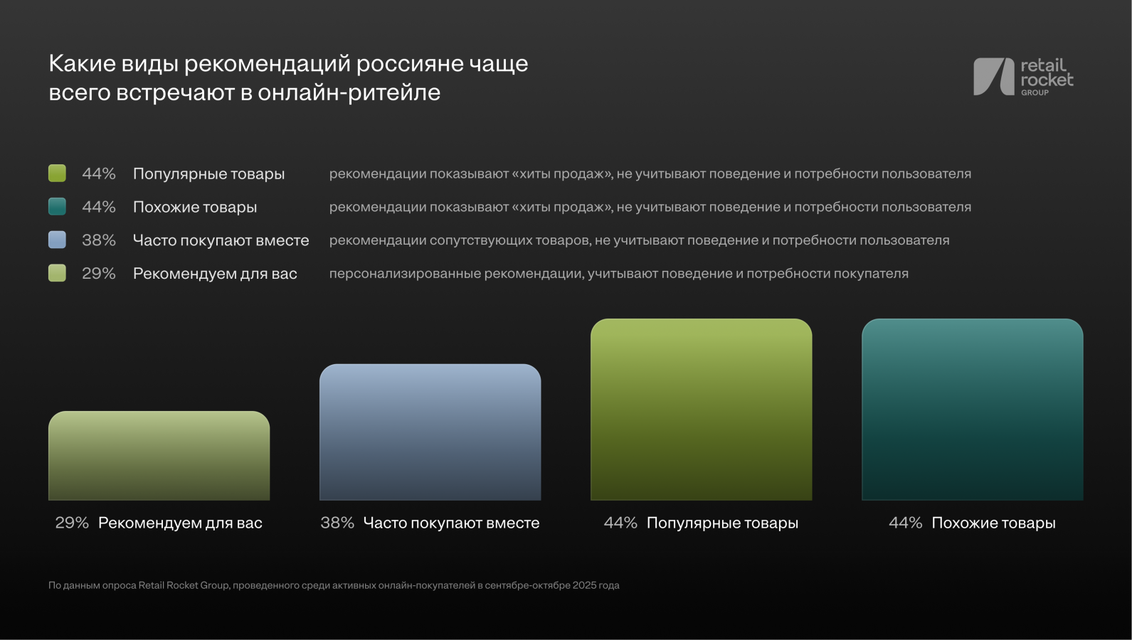 Большинство опрошенных видят рекомендации базового уровня — «Популярные товары» (44%) и «Похожие товары» (44%). С настоящей персонализацией сталкивались менее трети пользователей.