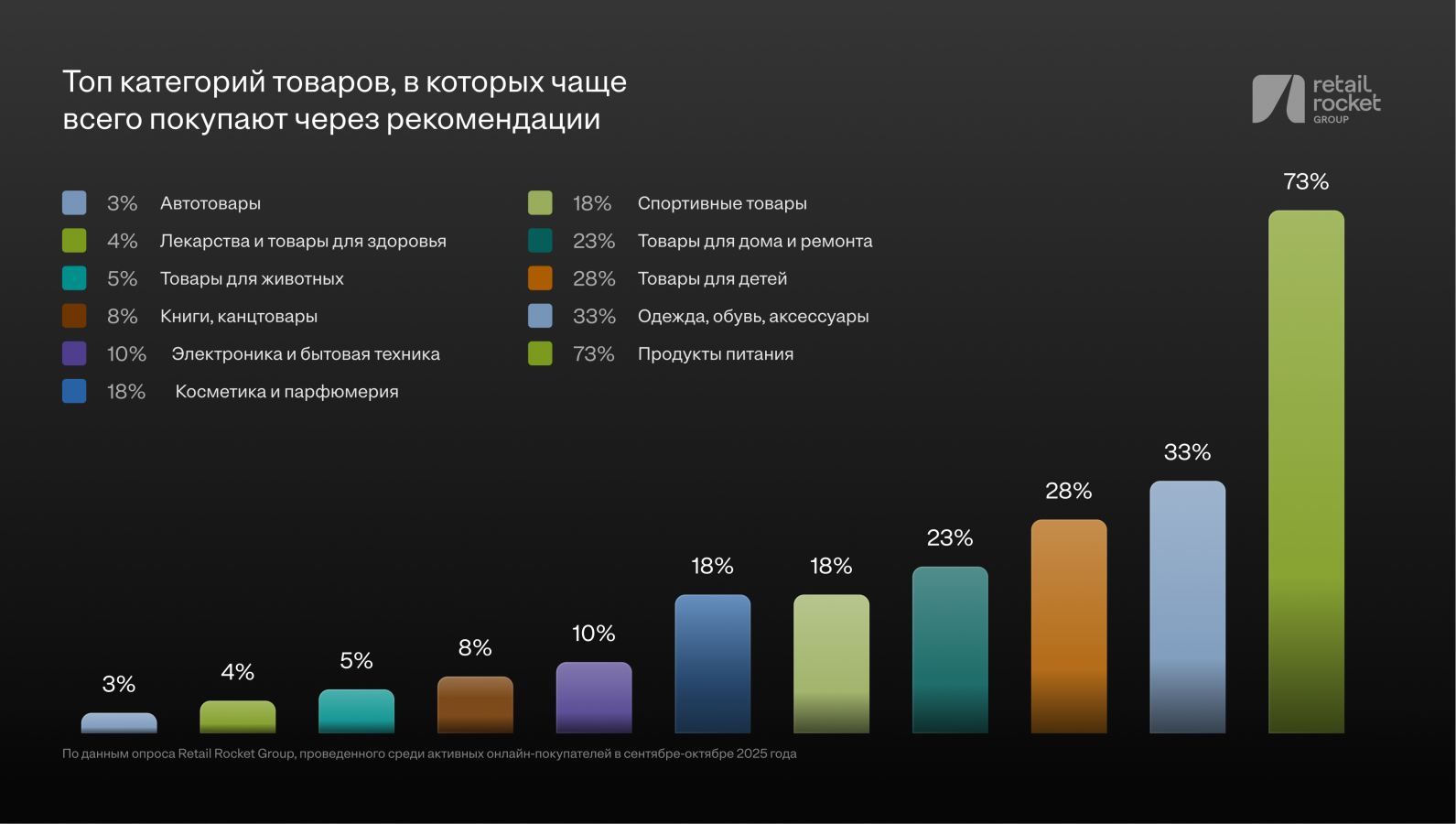 В некоторых товарных категориях рекомендации показывают большую эффективность: продукты питания (73% опрошенных отметили, что пользуются рекомендациями); одежда, обувь и аксессуары (33%); товары для детей (28%). Наименее эффективны рекомендации в категориях товаров для животных (5%), лекарств (4%) и автотоваров (2%), где покупатели предпочитают самостоятельный целенаправленный поиск.