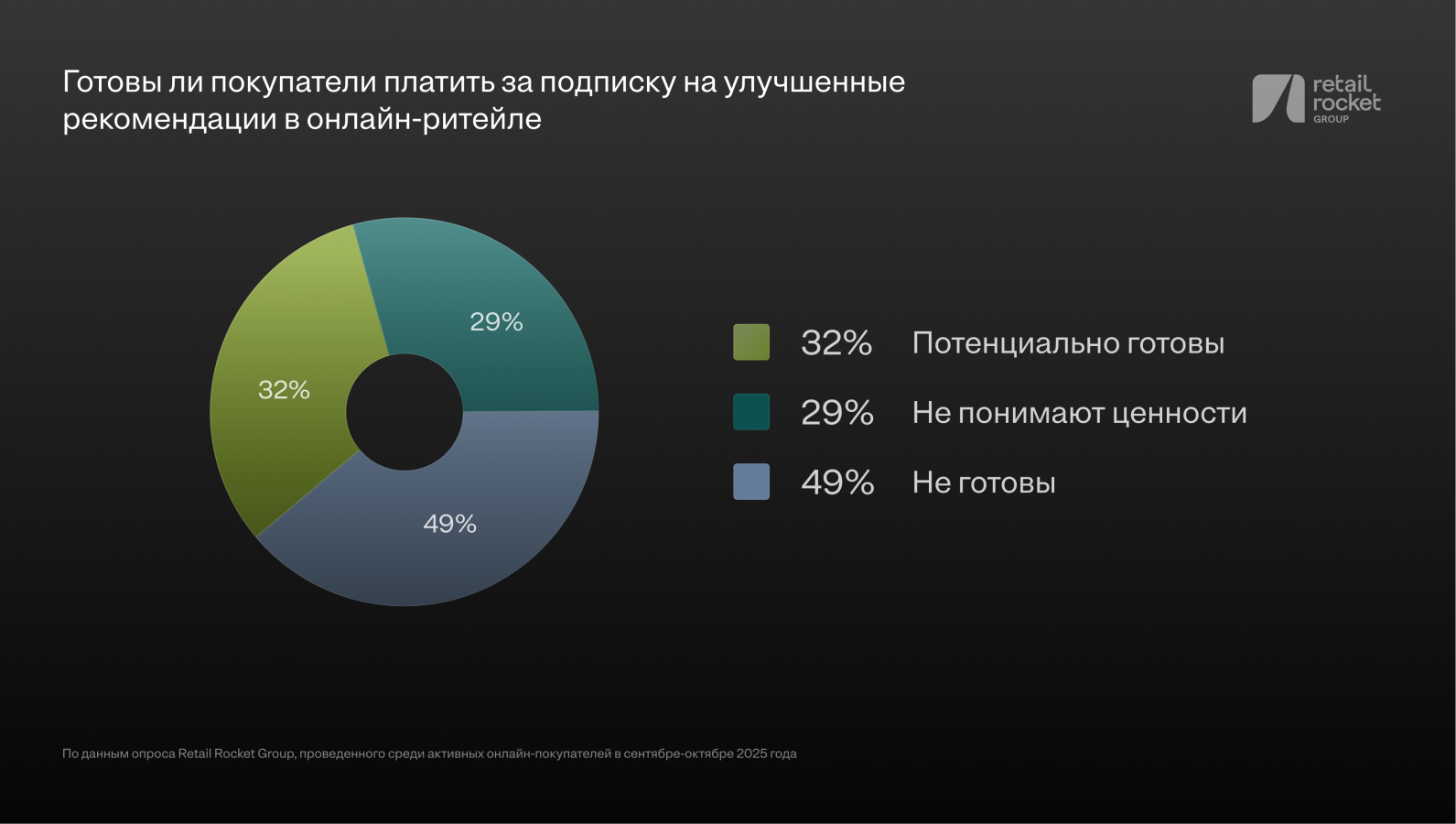 Больше 30% пользователей потенциально готовы оплачивать подписку за более качественные рекомендации по аналогии с музыкальными сервисами. 6% согласны тратить на 20% больше денег в магазинах с хорошими рекомендациями, 18% — на 5−20% больше. Среди активных покупателей через рекомендации эти показатели выше — 29% и 35% соответственно.