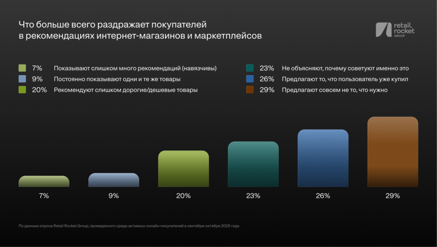 29% пользователей раздражает, когда им предлагают совсем не то, что нужно. 26% сталкиваются с рекомендациями уже купленных товаров. 23% не понимают логику рекомендаций из-за отсутствия объяснений. 20% получают товары неподходящей ценовой категории. Это напрямую влияет на покупательское поведение: 3% россиян регулярно покупают через рекомендации, 34% делали это несколько раз, 32% не покупали таким образом никогда.