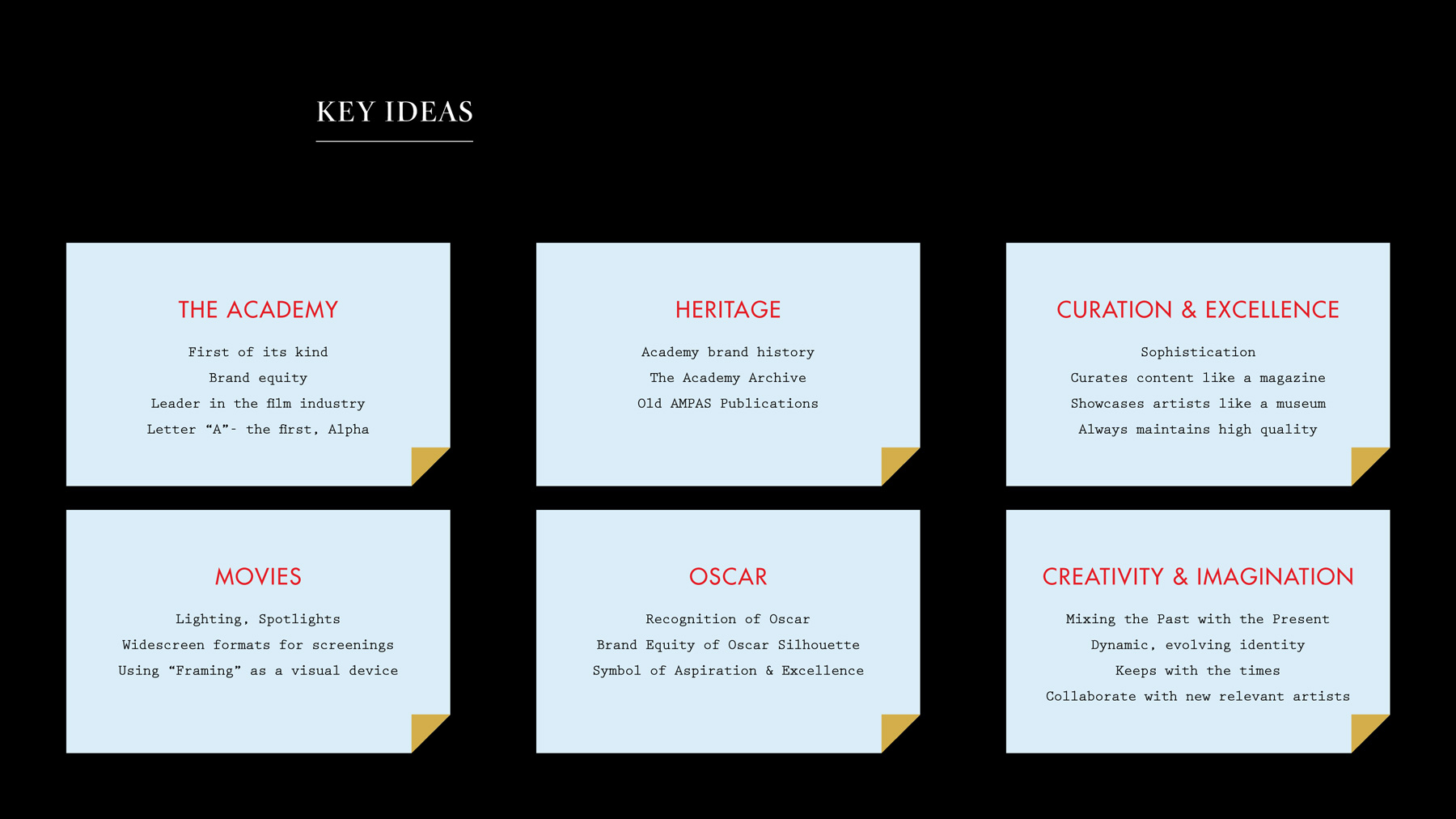 Киноакадемики и креаторы искали вдохновение в богатом наследии организации, особой атмосфере артистического сообщества. Новая визуальная идентичность отражает процесс творчества, талант, создание единой идеи из множества различных составляющих.