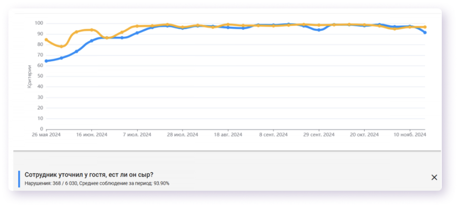 В условиях высокой конкуренции на рынке команда с первых дней взяла фокус на качество обслуживания. Понимая, что разовые проверки и точечные замеры не показывают реальной картины и слабо влияют на эффективность персонала, руководство внедрило собственный инструмент видеоконтроля. В зону кассы установили камеры и микрофоны, которые фиксировали смену, после чего управляющие отсматривали записи и самостоятельно выявляли нарушения.