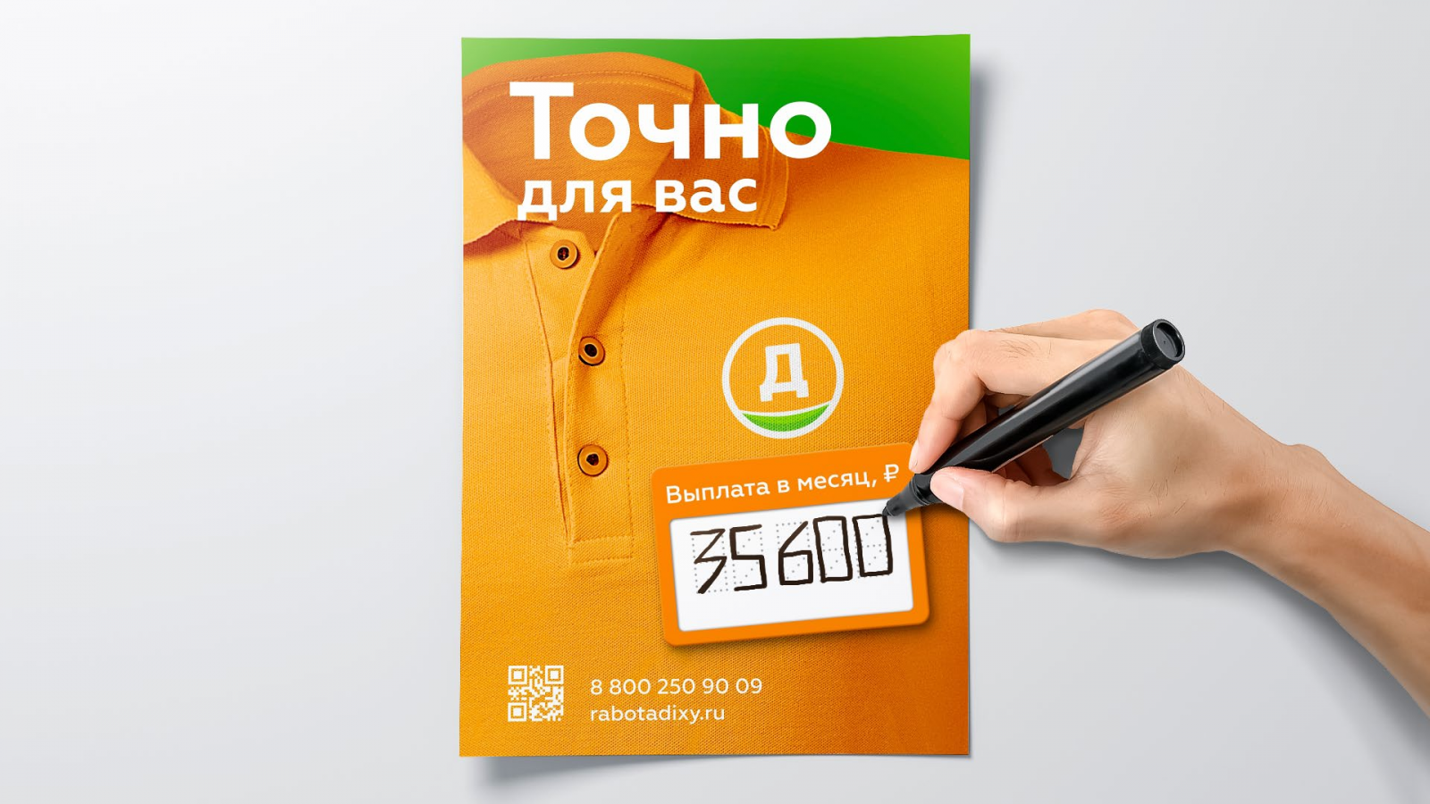 Пример от «Дикси»: генеральная HR-кампания, рассказывающая о фиксированном размере зарплаты за месяц, за смену и за час работы. На этом сделан акцент, а в качестве узнаваемого элемента бренда используется форма.