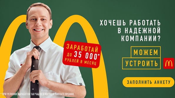 Надо понимать, что говорить о бренде — это не просто разместить логотип на макете. Классический пример — «Макдоналдс» и его рекламные кампании, построенные на фирменной букве М. «Просто начни с М» равно «просто начни с ребятами, в которых ты уверен: они большие, стабильные, возьмут тебя под крыло, всему научат, не бросят в сложной ситуации».
