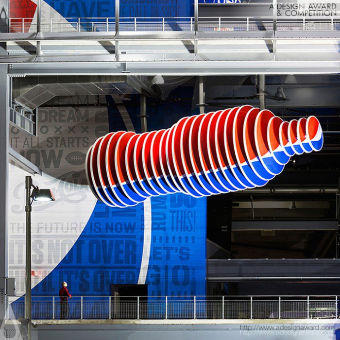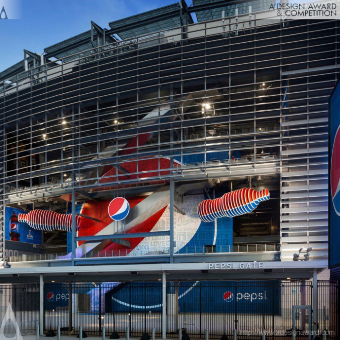 Дизайнерское подразделение PepsiCo Design and Innovation разработало необычный арт-объект под названием "Pepsi MetLife Stadium" для выставки. В основу дизайна легла скульптура бутылки, выполненная с помощью логотипов бренда.