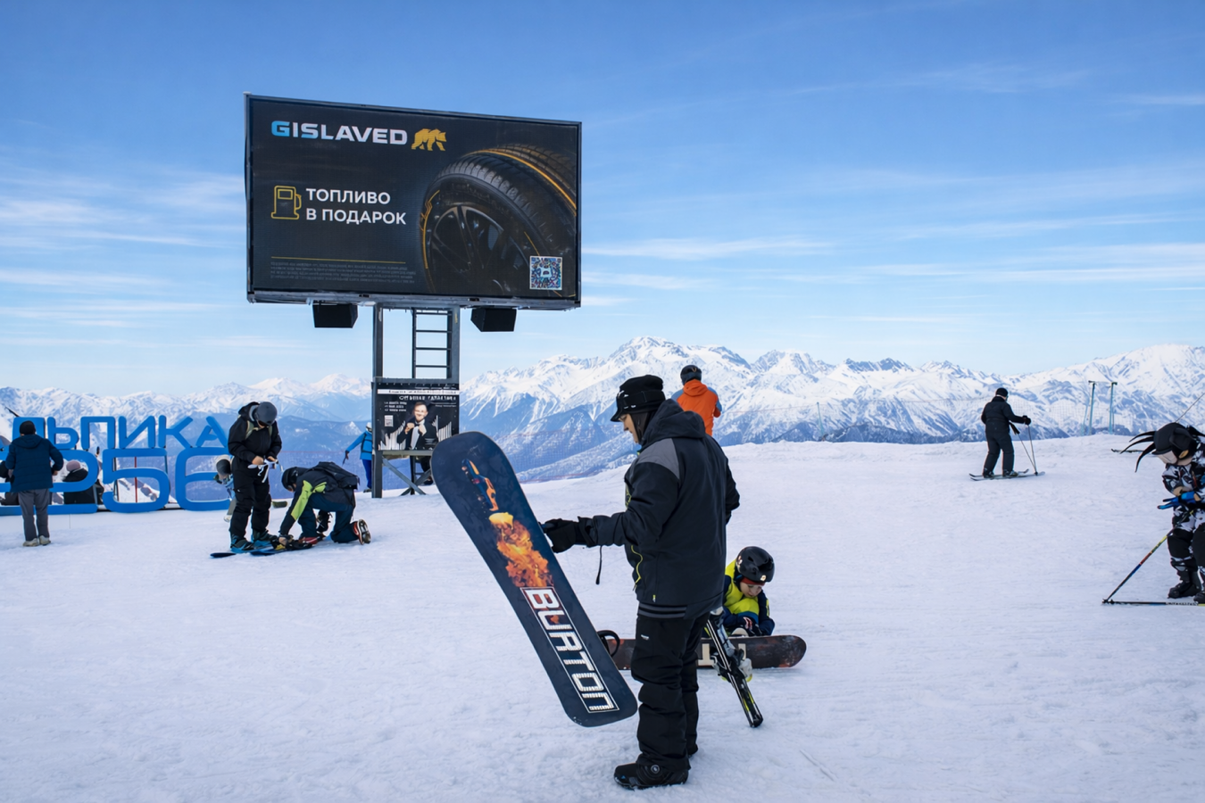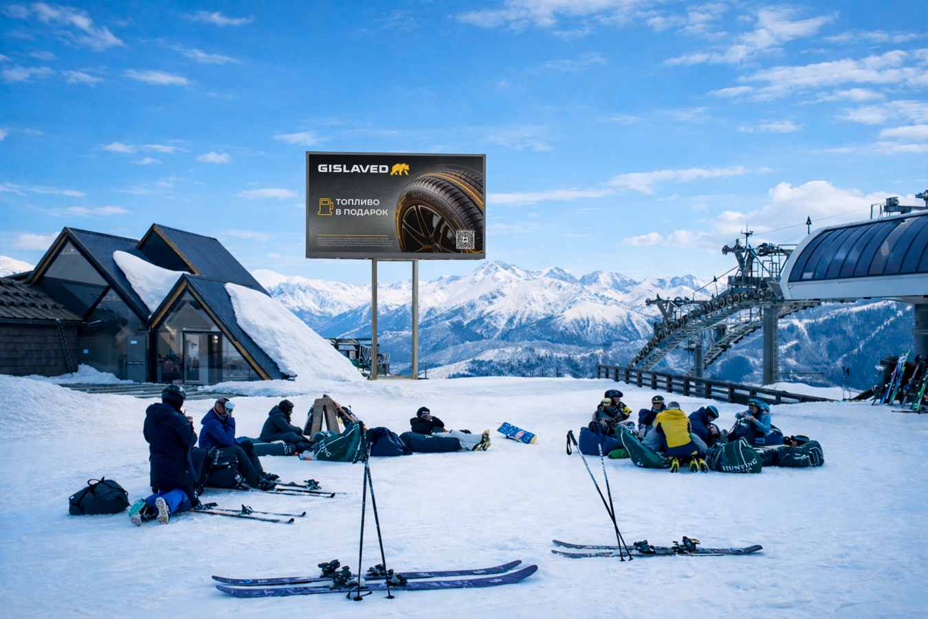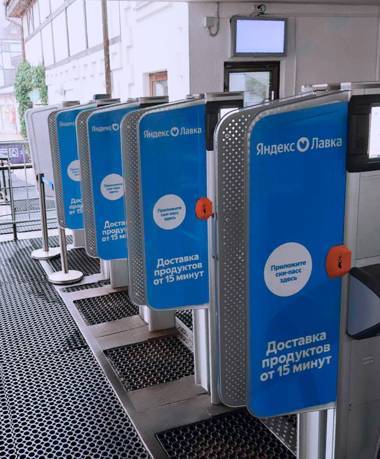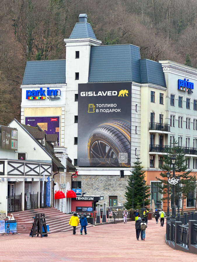 Для «Яндекс Лавки» брендировали турникеты канатной дороги «Стрела» на «Розе Хутор». Слоган про доставку в горах связал частые подъемы с удобством сервиса — заказ можно получить прямо на склоне или в отеле. Для Gislaved задействовали сразу несколько локаций: видеоэкраны на «Газпром Поляне» и «Красной Поляне», а также медиафасад отеля на «Розе Хутор».