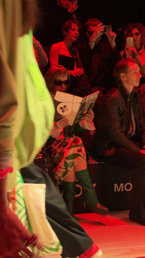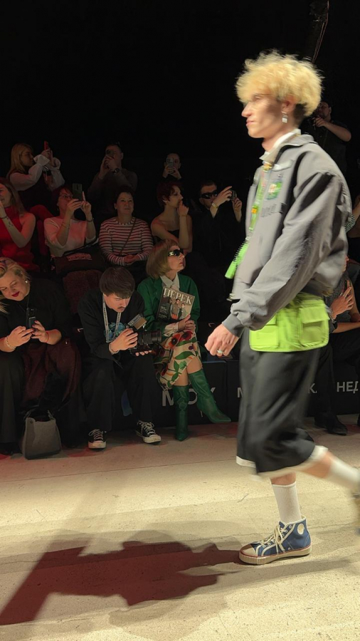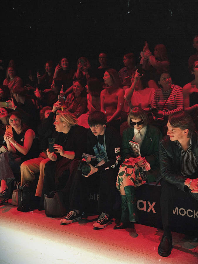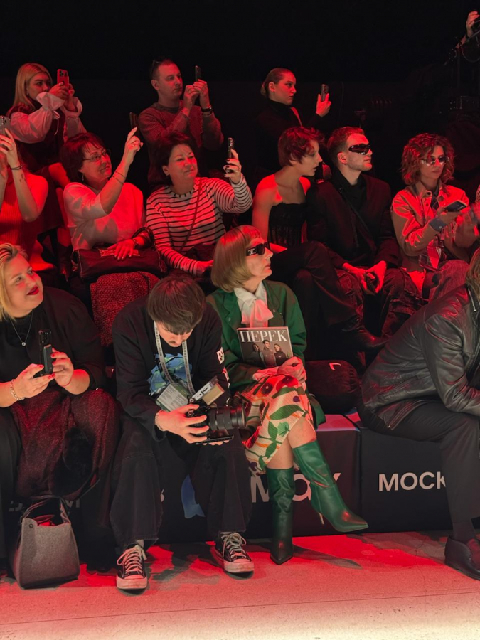 На Московская неделя моды показ формы для «Перекрёстка» и кафе Select превратился в перформанс. В первом ряду появилась «двойник» Анна Винтур — с бобом, черными очками и журналом «ПЕРЕК» как ироничной отсылкой к глянцу.