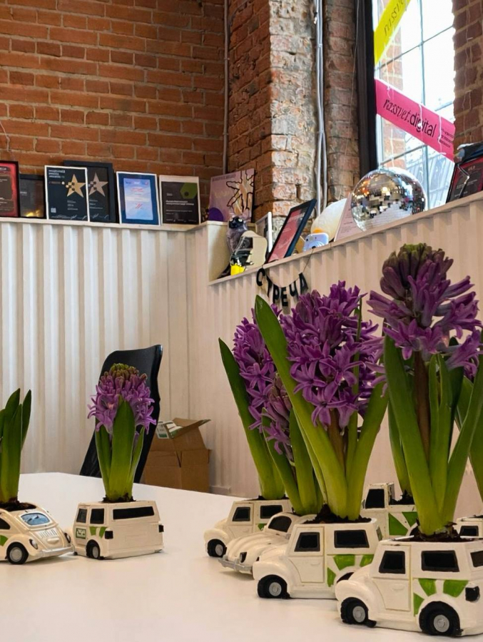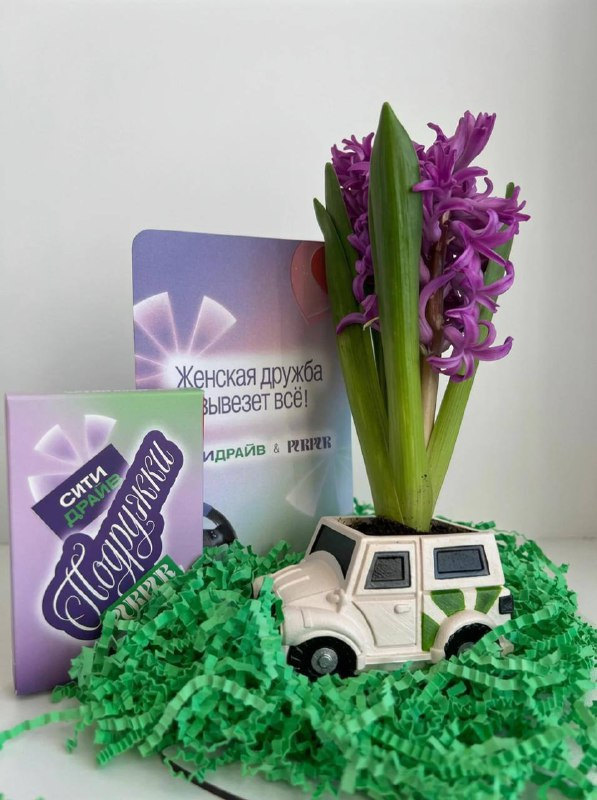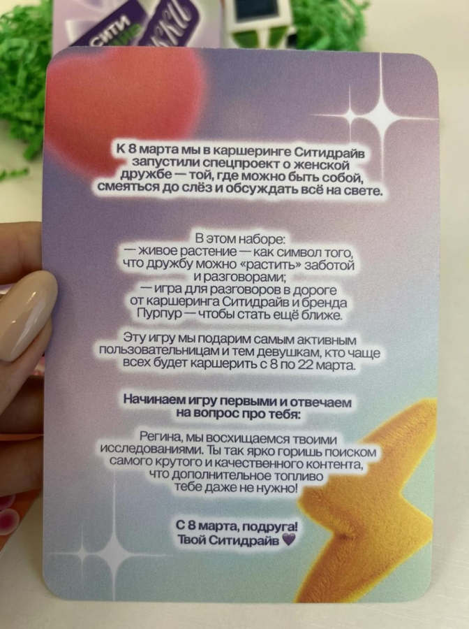 Креативы развернули в двух форматах. В Москве появились машины Ситидрайв с цитатами сотрудниц, работающих с автомобилями — от закупки запчастей до ремонта и перегона. Параллельно запустили рассылку подарков: блогерам отправили гиацинты в кашпо-машинках в стиле Ситидрайва и игру «Подружки» — как продолжение идеи о том, что дружбу можно «растить» заботой и разговорами.