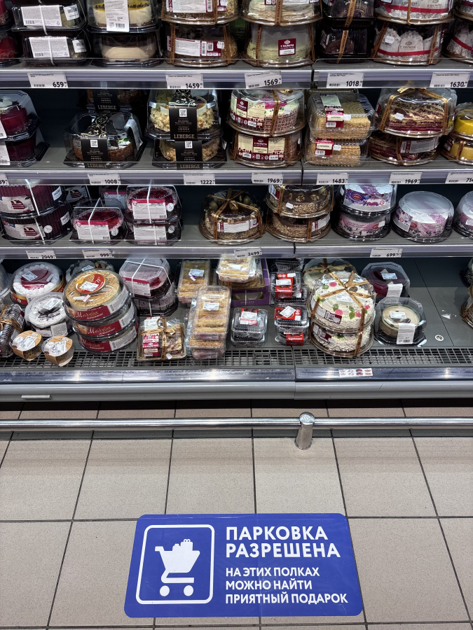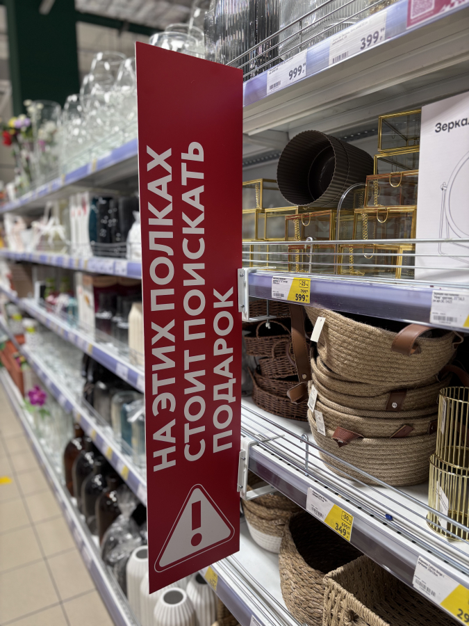 К 8 Марта «О'КЕЙ» запустил в магазинах «Навигатор по подаркам» — систему подсказок прямо в торговом зале. Напольные указатели и таблички с ироничными фразами помогают быстро найти цветы, сладости, товары для дома и другие универсальные варианты.