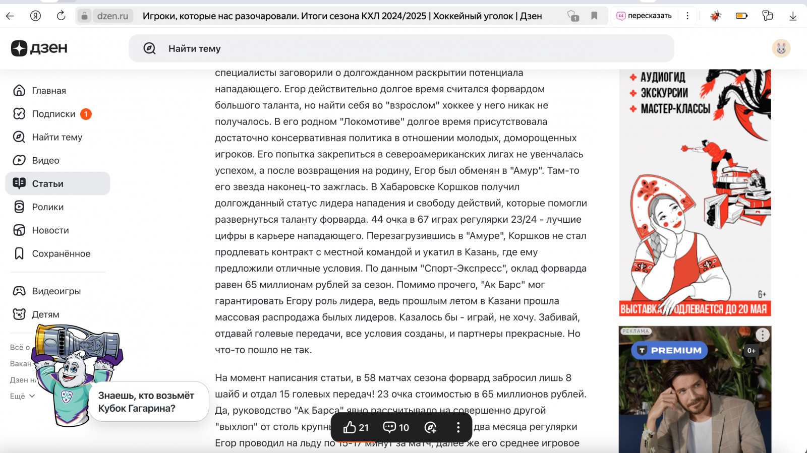 - Редакционные материалы. Совместно с хоккейным экспертом подготовили 10 статей: от аналитики матчей до историй о героях КХЛ. Инструмент решил задачу пользы для хоккейных болельщиков. Материалы присутствовали в теме КХЛ и продвигались по CPM-модели, показав рост CTR +0,21% от плана.