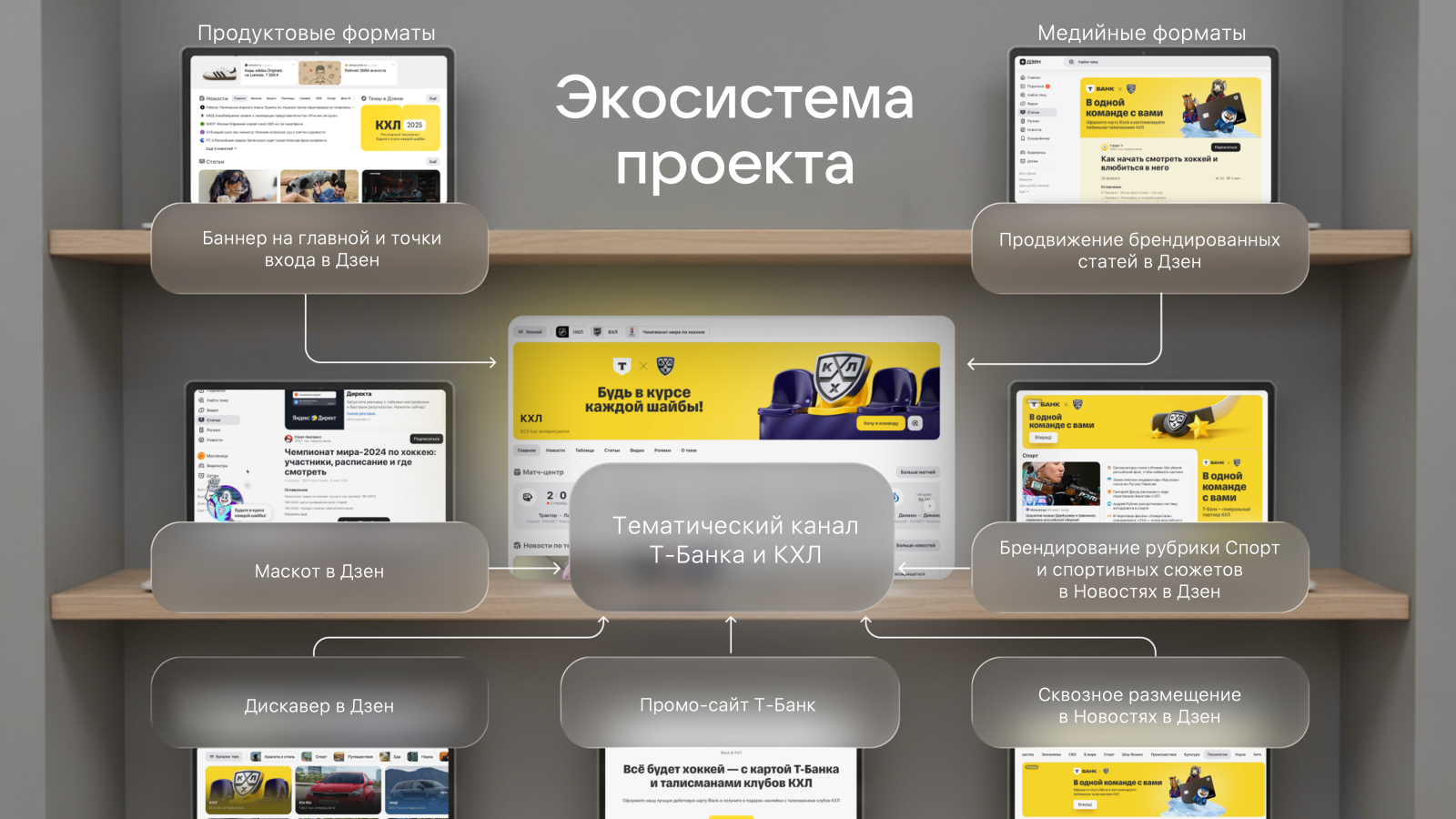 Чтобы объединить ценности спорта и бренда в едином пространстве, команда «Дзена» разработала комплексную коммуникацию внутри тематического канала, посвященного КХЛ, которая стала базой для формирования хоккейного имиджа банка.