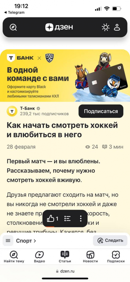 С февраля по май 2025 года — в финальной части сезона КХЛ и розыгрыша «Кубка Гагарина» — «Дзен» вместе с «Т-Банком» провели масштабную имиджевую кампанию среди любителей хоккея. Интеграция в тематический канал, связанный с КХЛ и спортом, позволила банку оказаться в центре живого комьюнити главного хоккейного турнира России и предложить пользователям разнообразный контент: от редакционных материалов, написанных спортивными экспертами, до игр и квизов. Команда проекта рассказала Sostav, как интеграция в тематический канал, связанный с КХЛ и спортом, позволила банку повысить лояльность среди комплементарной бренду мужской аудитории.