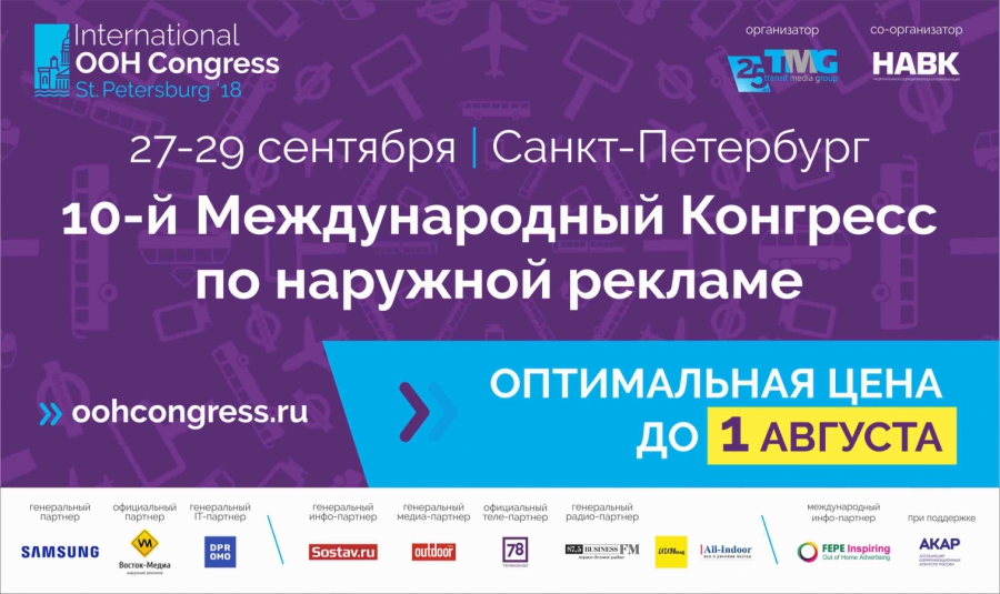 Партнеры Конгресса: Генеральный партнер Samsung, Официальный партнер «Восток-Медиа», Генеральный IT-партнер D-Promо. Генеральный инфо-партнер Sostav.ru, Генеральный медиа-партнер Outdoor.ru, Официальный теле-партнер Канал 78, Генеральный радио-партнер Business Fm. Информационные партнеры: OOH Mag, All Indoor Международный инфо-партнер FEPE International, при поддержке АКАР.
