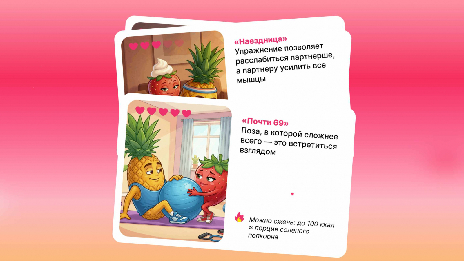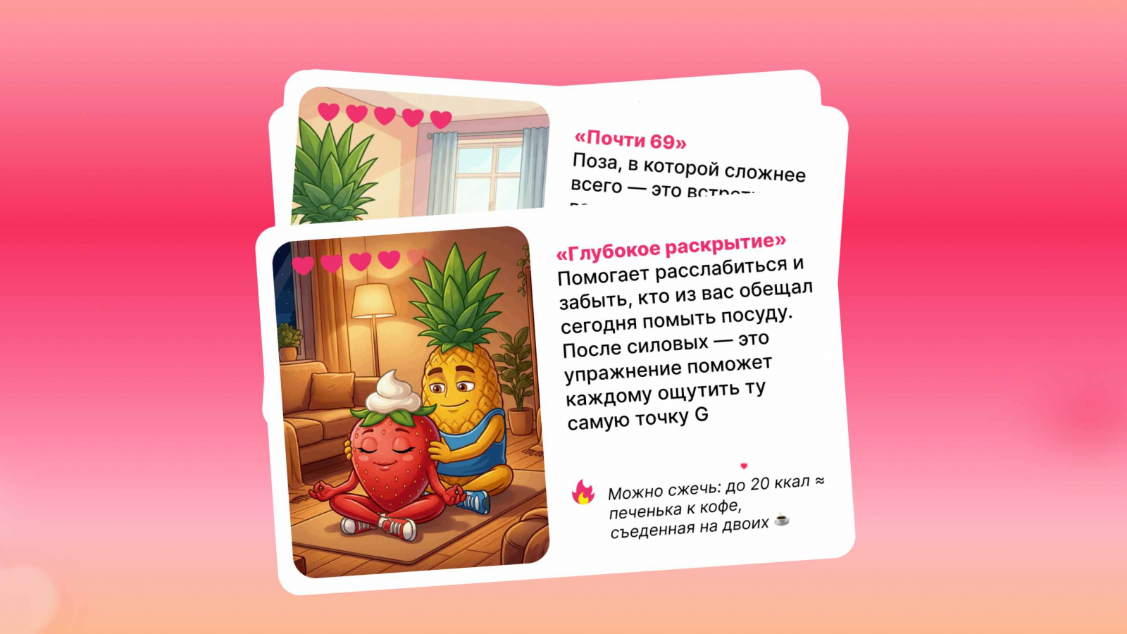 Grow Food решил, что романтический ужин — это только начало, и запустил к 14 февраля фитнес-платформу «ПОТеРЕБИ». Вместо валентинок пользователи получают карточки с парными упражнениями и подсчетом сожженных калорий. Формат варьируется от расслабленных «Ложек» до почти акробатического «Шотландского штурвала», а «Миссионерская планка» обещает нагрузку на все группы мышц. Даже для удаленщиков предусмотрели лайфхак: можно «подключиться через пять минут» и успеть размяться. Кампания иронично напоминает о главном риске праздника — переедании, предлагая не отказываться от удовольствий, а просто сделать их активнее. Подробнее на Sostav.