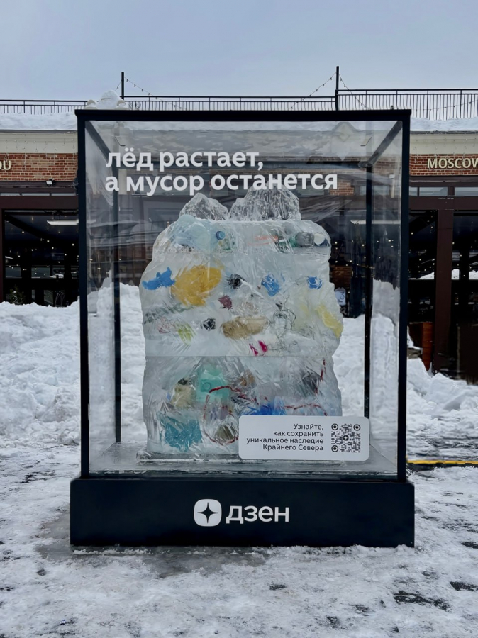 «Дзен» запустил просветительский проект ко Дню Арктики, объединив ледяную инсталляцию в Москве и тематический канал с материалами о людях, экспедициях и экологических инициативах Крайнего Севера. Арт-объект расположен на территории «Три вокзала. Депо»: в толще льда заморожены фрагменты пластика и бытового мусора, с каждым таянием лед раскрывает последствия человеческой деятельности. Надпись на поверхности — «Лед растает, а мусор останется» — акцентирует внимание на быстроте изменений природы и медленной деградации окружающей среды.