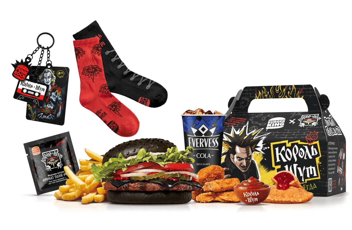 Burger King запустил промо к премьере фильма о «Короле и Шуте», где упаковка и вложения работают как единый визуальный слой. В центре — брелоки с эскизами, вдохновленными эстетикой группы, и строками из песен. За производство отвечало агенство
