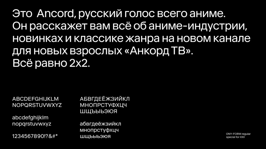 Поскольку стиль построен на эстетике интернета, типографика играет в нем огромную роль, мы выбрали собственный, специально разработанный для веба шрифт — Ony Form Digital. Это универсальный гротеск, который достойно выглядит как в крупных заголовках, так и в мелких кеглях при малом разрешении. Этот контраст размеров активно используется в айдентике.