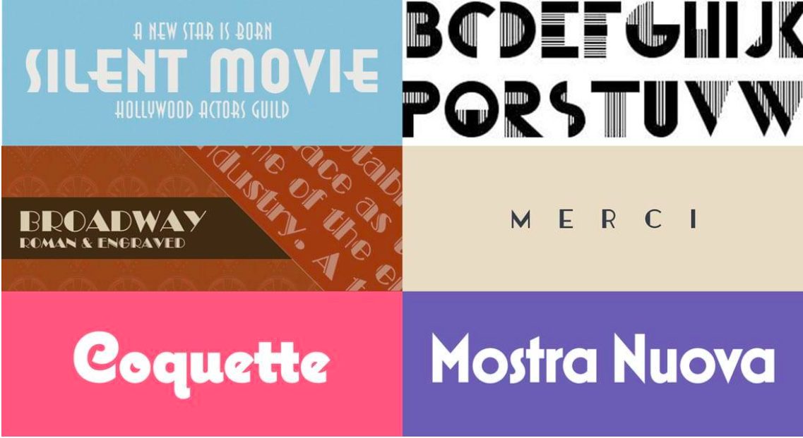 Особенность шрифтов в стиле ар-деко — преувеличенный контраст, а иногда и с измененными пропорциями. Обычно они не имеют курсивных начертаний.