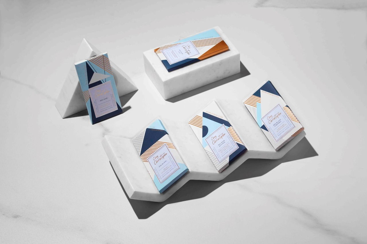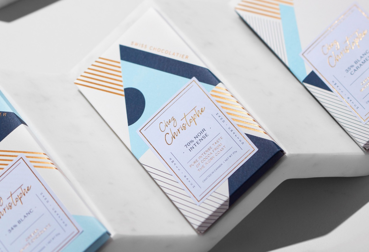 Канадское агентство Arithmetic представило современный пример динамичного дизайна упаковки швейцарского премиального шоколада Chez Christophe. Проект получился сдержанным за счёт цветов и минималистичным за счёт форм. Из ар-деко дизайнеры использовали геометрические фигуры (преимущественно треугольники), повторяющиеся линии, золотое тиснение.