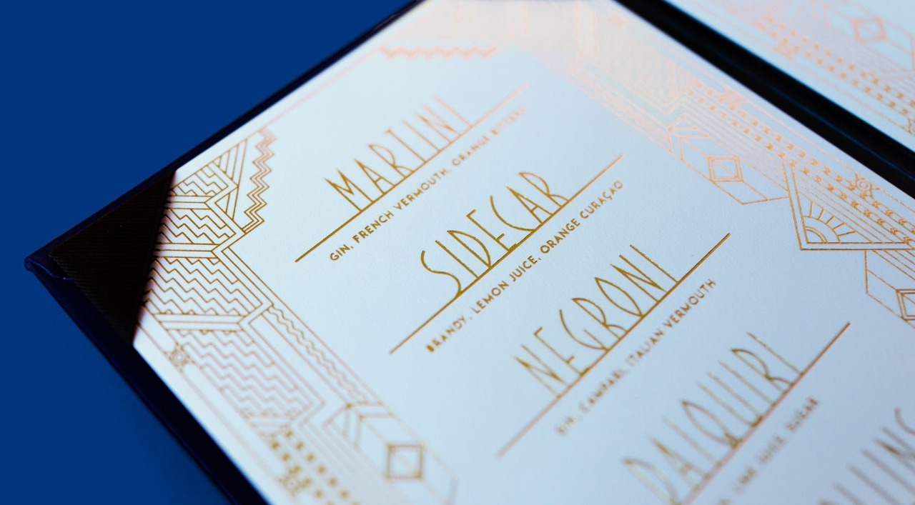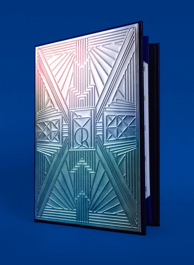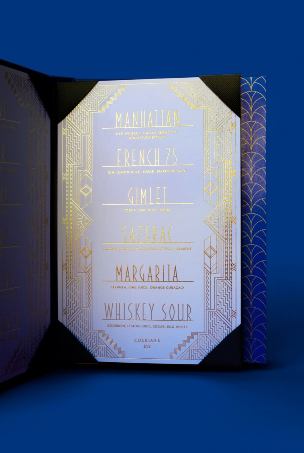 Меню представляет собой сделанную на заказ книгу в обложке из штампованного алюминия. На страницах внутри меню, проштампованных золотой фольгой, представлены основные блюда. Это меню получило множество наград за дизайн, но главная радость дизайнеров в том, что гости бара частенько забирают его с собой как сувенир.