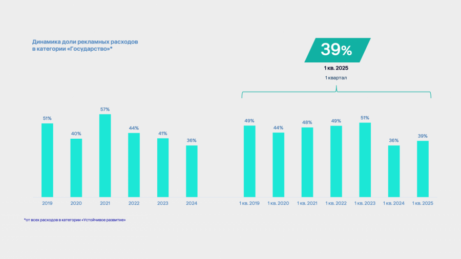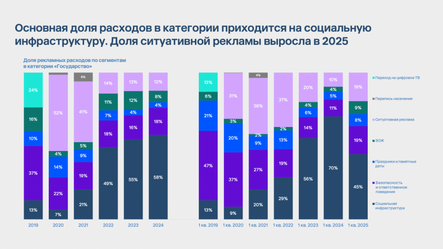 В сегменте «Государство» рекламные бюджеты перераспределяются в зависимости от текущей общественно-политической повестки. Основная доля расходов в категории приходится на социальную инфраструктуру. На протяжении последних лет именно на нее приходилась наибольшая доля расходов: программы благоустройства, инициативы по улучшению городской среды, волонтерские проекты и социальные кампании о качестве жизни. В первом квартале 2025 года ее доля снова лидирует — 45% всех расходов сегмента направлены именно сюда.