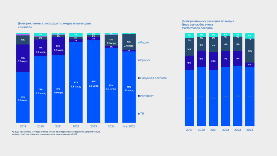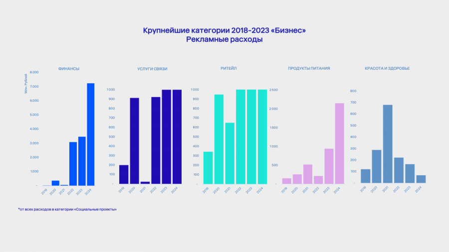 Темпы роста «Бизнеса»: с 2018 года по 2024 год их медиаактивность в категории выросла в 23 раза (с 806 млн до 18,33 млрд рублей). При этом категория в целом за период 2018−2024 годов выросла в 8 раз (с 4 млрд до 33,4 млрд рублей).
