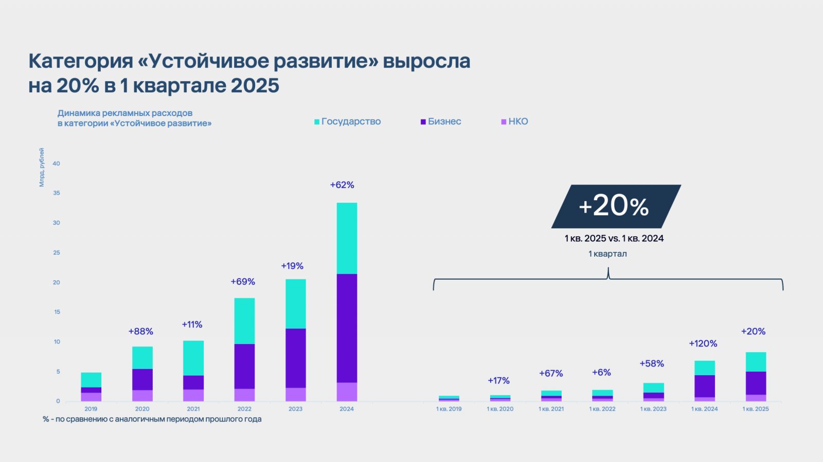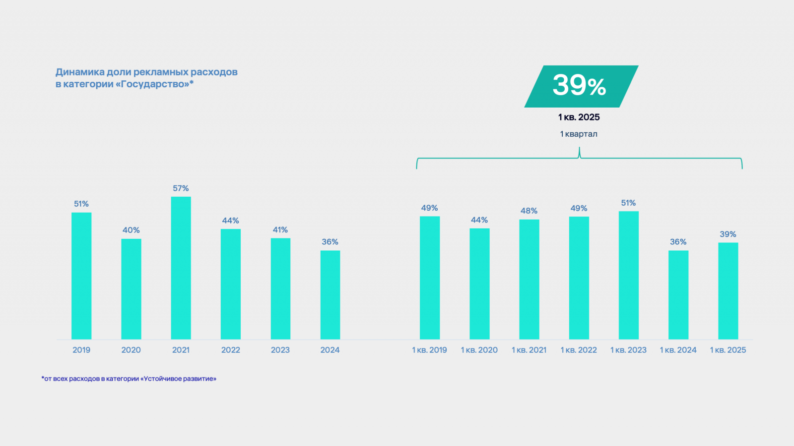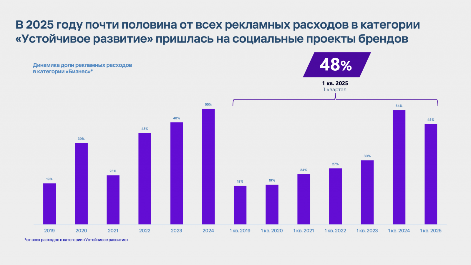 Основная доля расходов в категории «Устойчивое развитие» в 2025 приходится на сегмент «Бизнес», который увеличил рекламные инвестиции на 6% по сравнению с первым кварталом 2024, и составил 3,96 млрд рублей только за первый квартал 2025 года.
