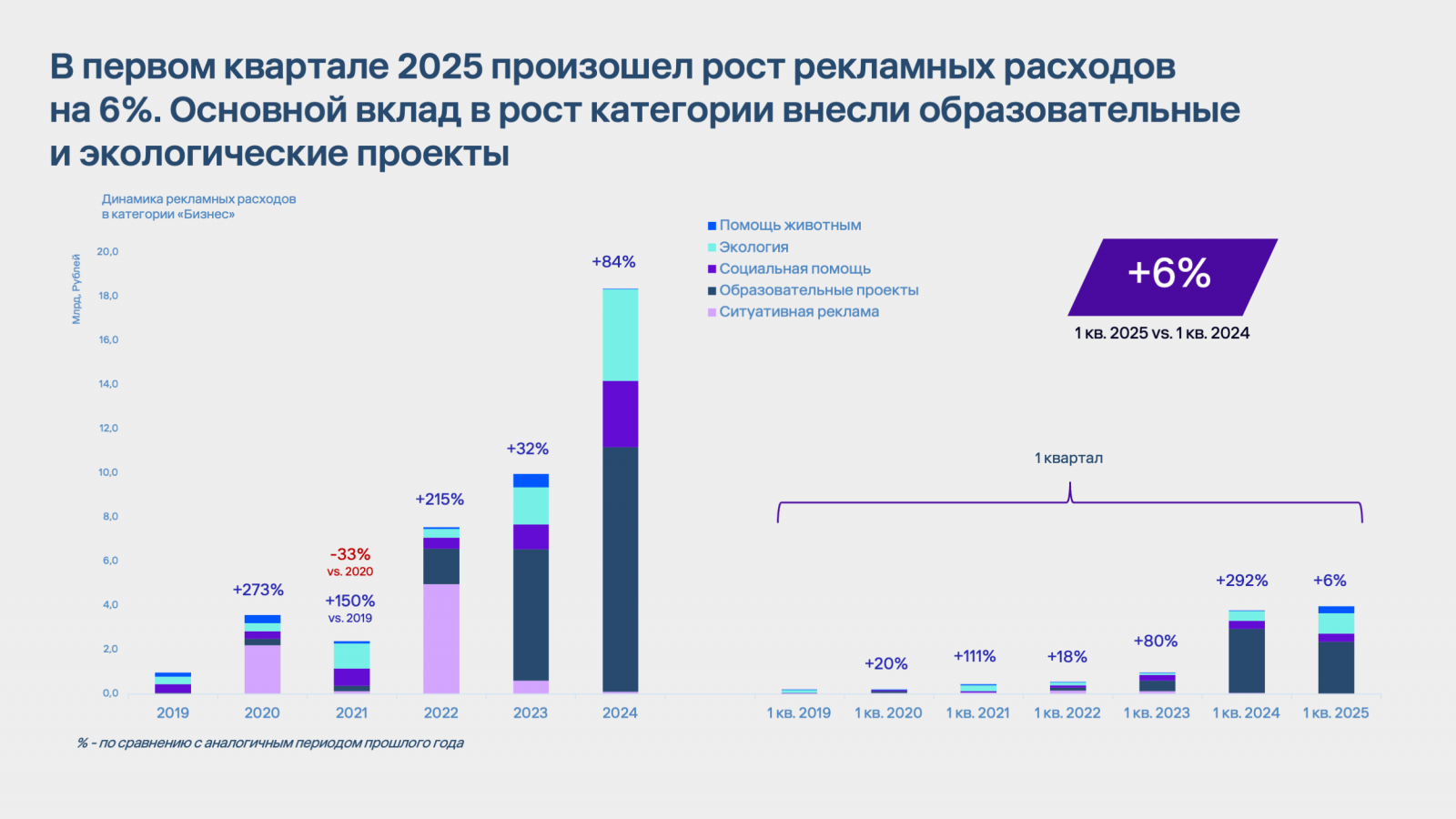 Сегмент «Бизнес» демонстрирует рост рекламных расходов на 6% в первом квартале 2025 года по сравнению с аналогичным периодом 2024. Несмотря на умеренный темп роста по сравнению с другими сегментами (например, НКО — +62%), бизнес остается крупнейшим игроком по абсолютному объему инвестиций в социальной повестке.